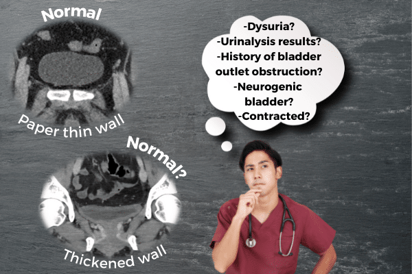 Another common example is when we struggle to differentiate pathologic bowel or bladder wall thickening from underdistention, both of which can look similarly thick-walled. Both entities can have a similar appearance and only the presence of symptoms or test results (e.g., urinalysis) can help differentiate between the two.